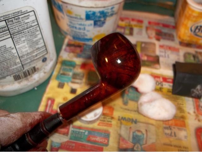 To polish the prepped pipe, I used red and white Tripoli, White Diamond and carnauba, and after rubbing the wood with a cotton rag saw it needed another round on all of the buffers except the red Tripoli.