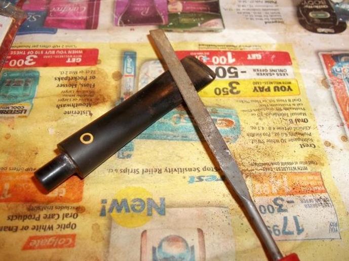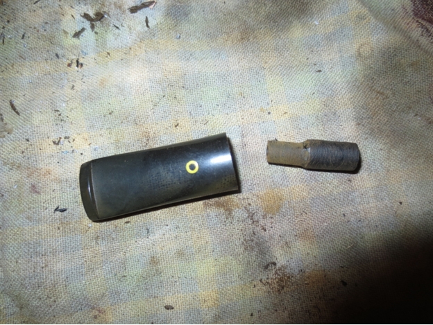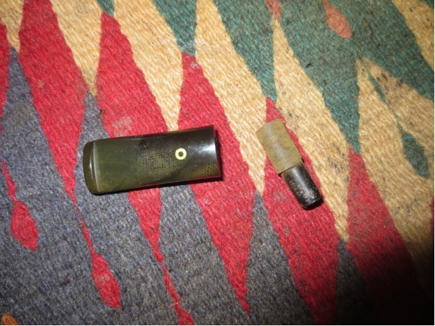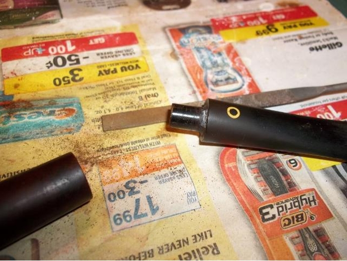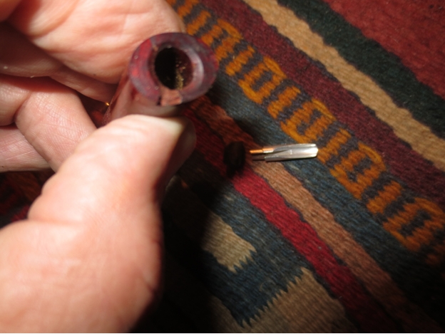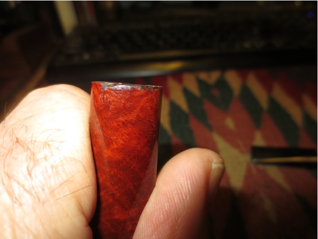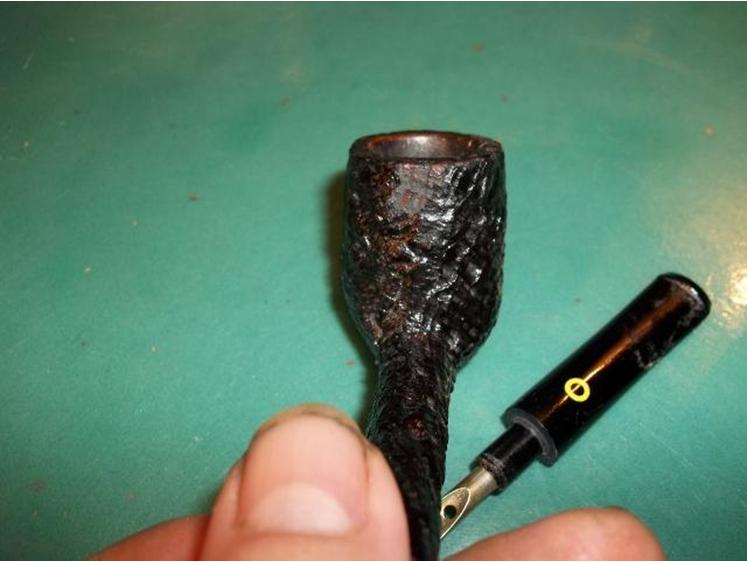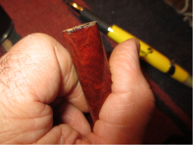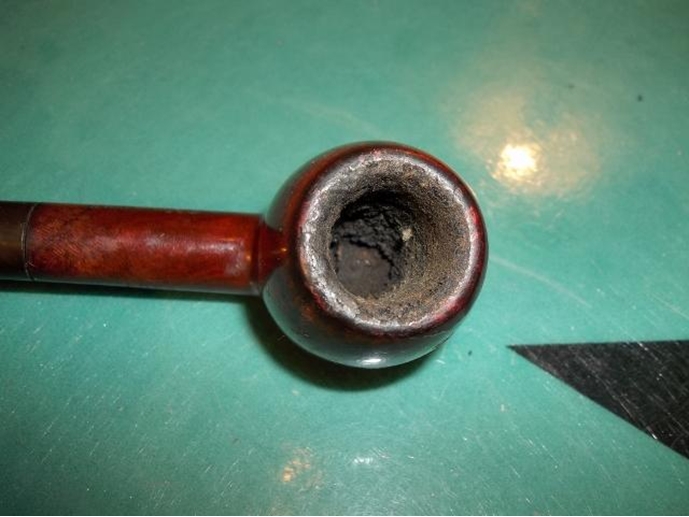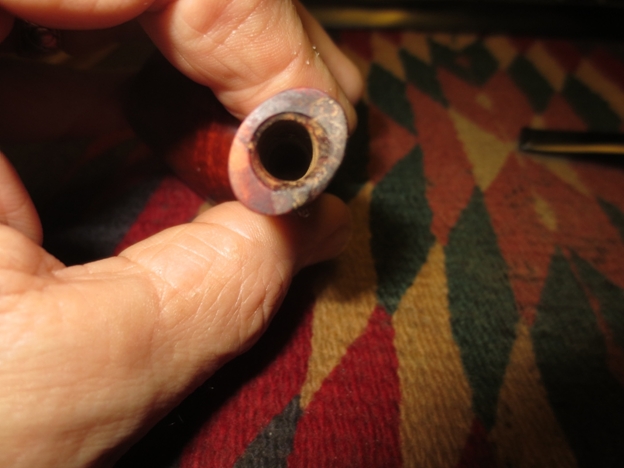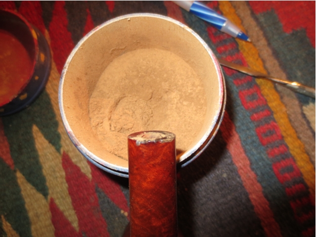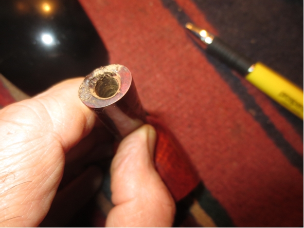 Moving on to the chamber, I was startled when most of the cake crumbled from the walls with a couple of turns of the reamer. Still more shocking was the sudden appearance of a thin coat of the original yellow product of honey curing. I knew I had a rare find and wondered at the short-term but intense enjoyment of the pipe that could have led to more than average cake but left the prominent yellowing intact. The rest of the cake came clean with gentle 400-grit sanding.