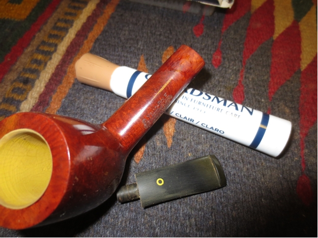 Staying with the 400-grit paper to remove scratches and dings on the beautiful briar, I lightened the color still more and found a few fills and other grain flaws that accounted for why this finely shaped bulldog didn’t end up with, say, a Kaywoodie stamp.